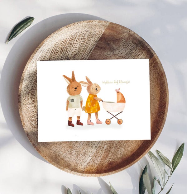 Een warm geboortekaartje boordevol liefde! De tekening van de konijntjes met wandelwagen werd gerealiseerd met alcoholmarkers.